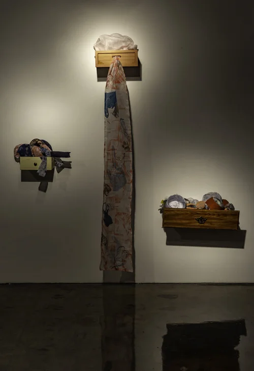 found object, gouache, screen-print on fabric , 38”x60”x36” , 2023.